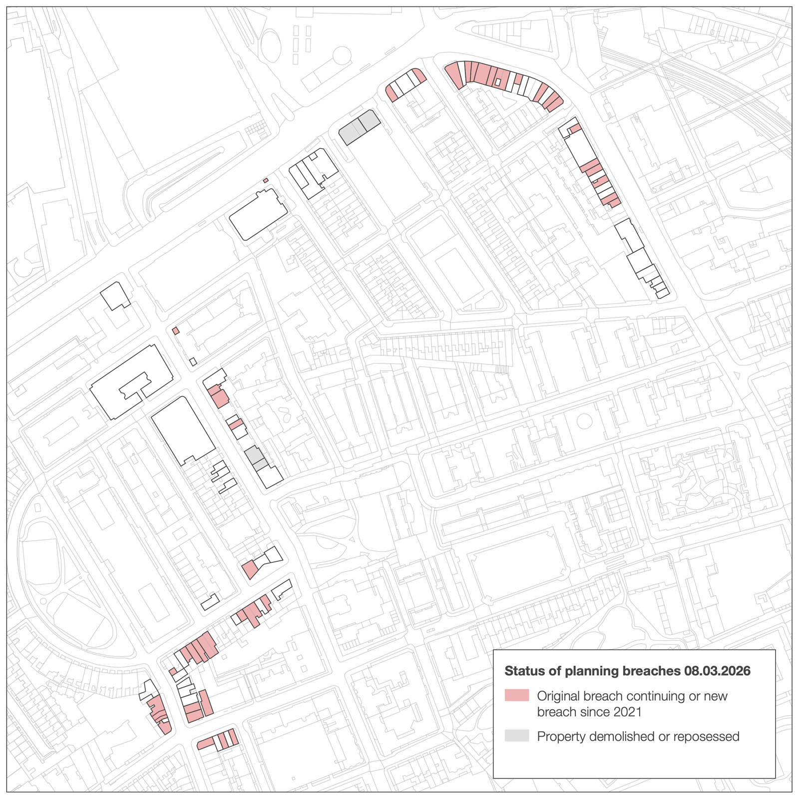 The aim of this article is to shed some light on the efficacy of enforcement in Camden and particularly the central areas. This is achieved by examining the enforcement status of 96 commercial sites in Bloomsbury and King’s Cross over the period 2021-26. In particular, we can consider the following questions: